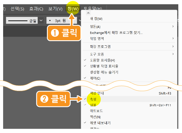 - [창]-[속성] 클릭