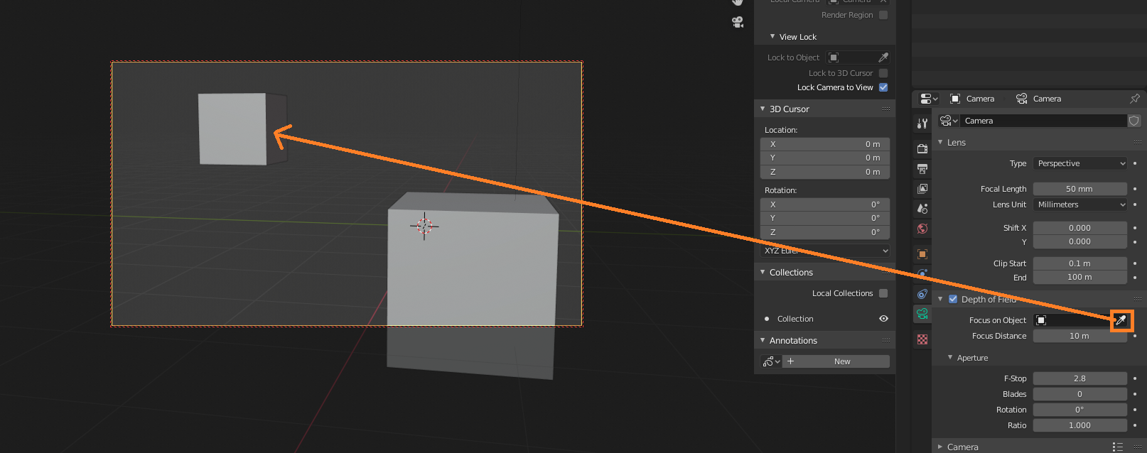 [Depth of Field] 체크한 후[Focus on Object] 부분의 [스포이드 모양]을 클릭 후