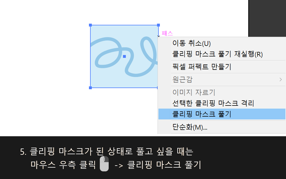 푸는 방식은 마우스 우측 클릭 후 [클리핑 마스크 풀기]를 선택하면 됩니다.
